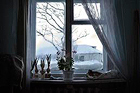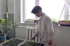長く続く冬のため、室内でトマトの苗を育てている。春先に、小さな町のバザールで売り、年金の足しにする。 |