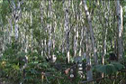 フキと白樺に包まれた墓地。墓標にはキリル文字の他に、ハングルにて記されているものも多い。 |